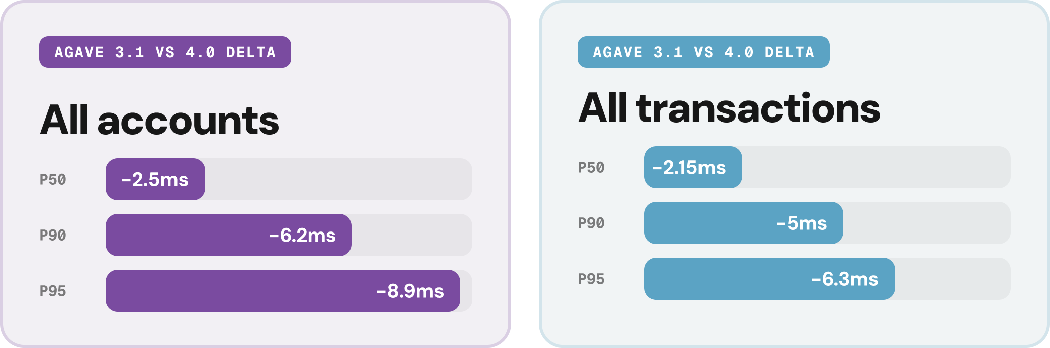 - On our side-by-side test against v3.1, v4.0 was 2-9ms faster at P50/P90/P95 on both accounts and transactions, measured across all Solana updates