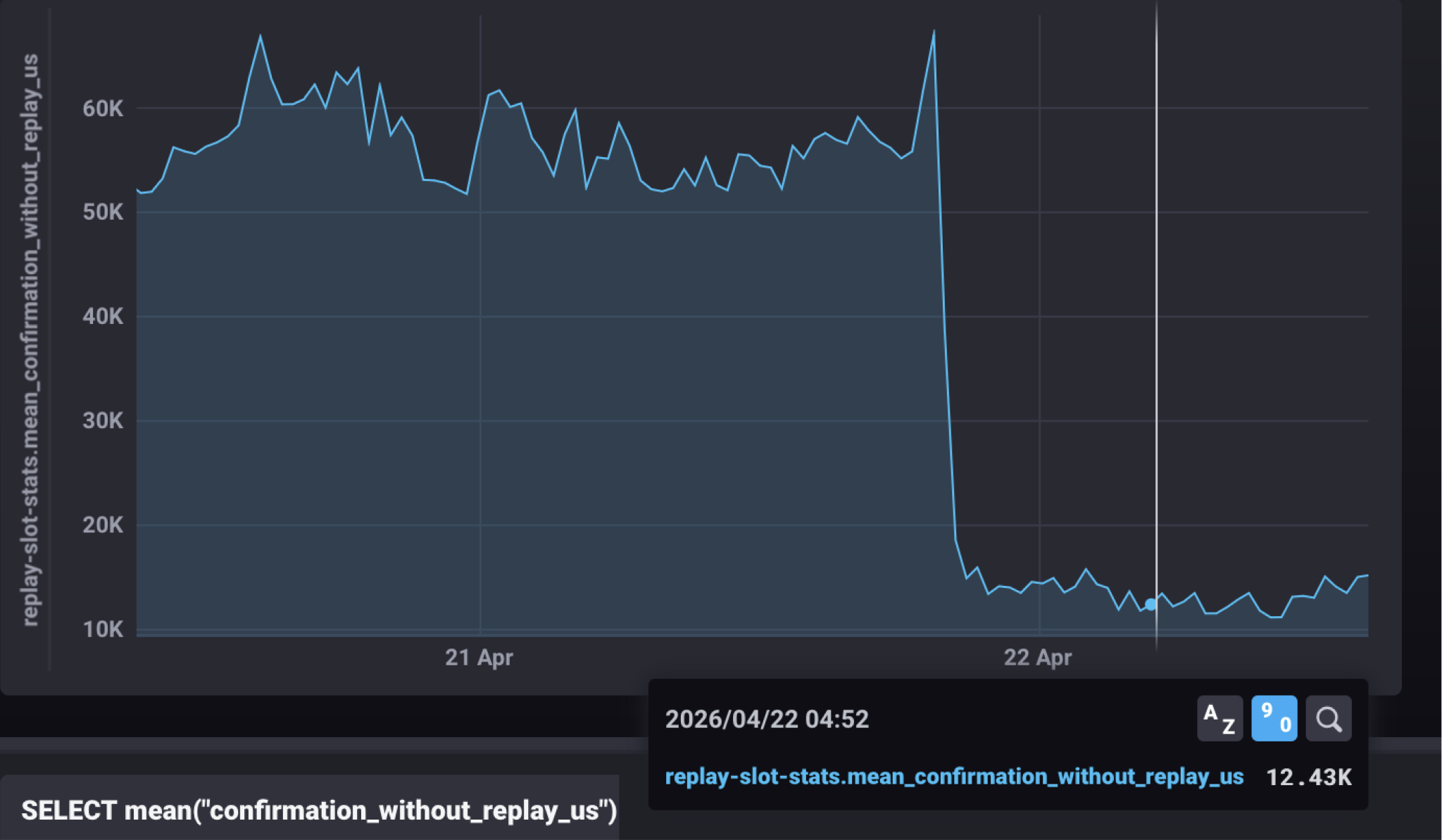 Two targeted changes in v4.0 moved the heaviest verification work off replay's hot path and onto background threads. Anza's metric mean_replay_blockstore_us shows an almost 3x reduction in how long the replay thread is busy per slot, dropping from ~130ms to ~50ms!