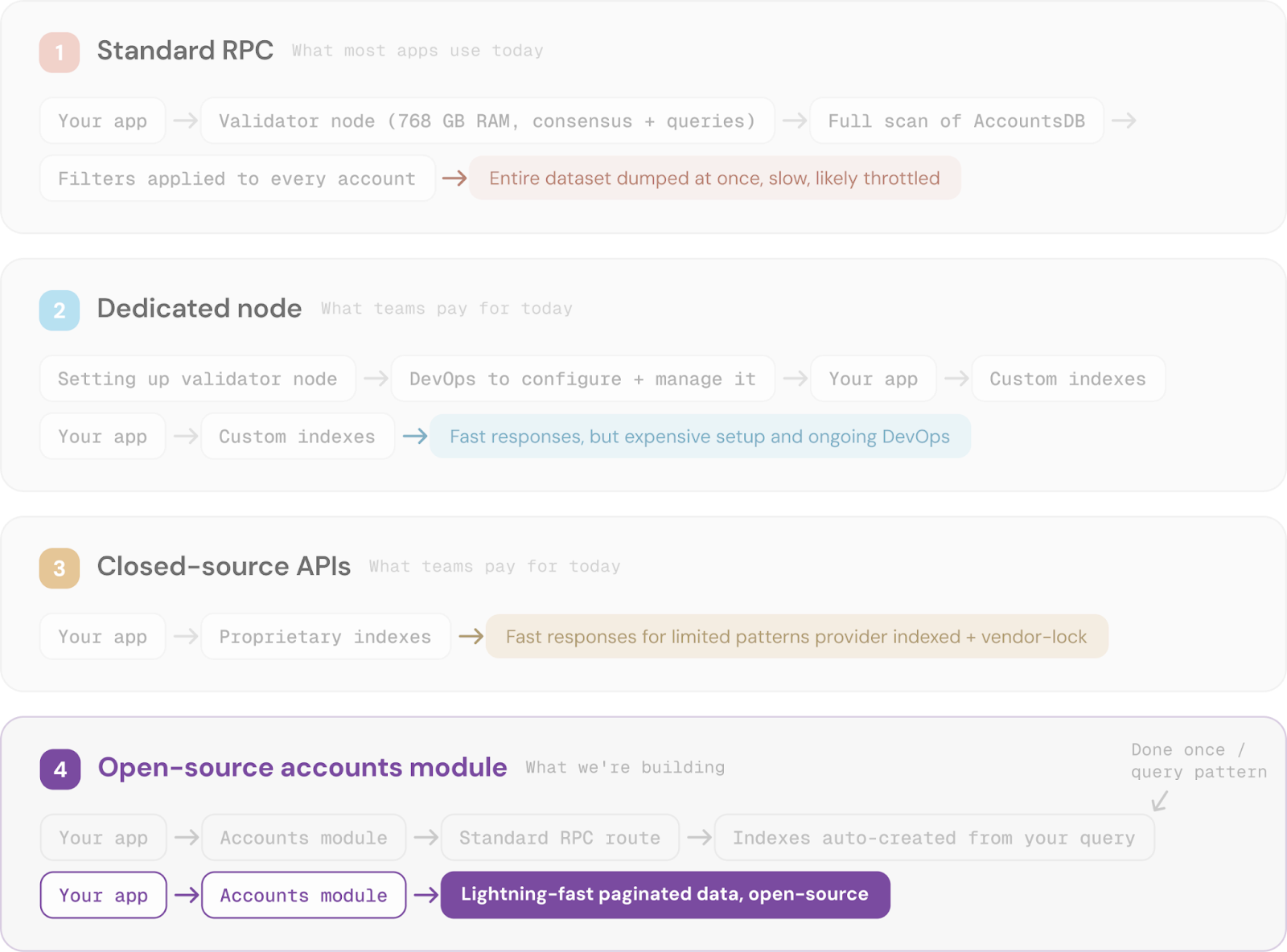 The accounts module replaces the validator's built-in account queries with a dedicated ingest-index-serve pipeline. Here's how it compares to the three ways you can get the data today: