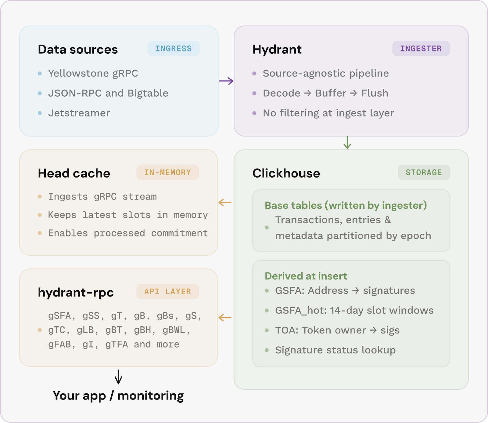 The API layer sits in front as a stateless JSON-RPC server, reading from ClickHouse or, for the most recent slots, from an in-memory head cache that serves responses in under a millisecond.