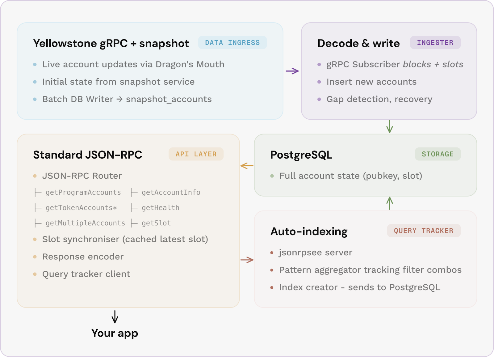 Account updates stream in via Yellowstone gRPC, with a snapshot loader seeding the full account set on first startup, so queries return complete results immediately.