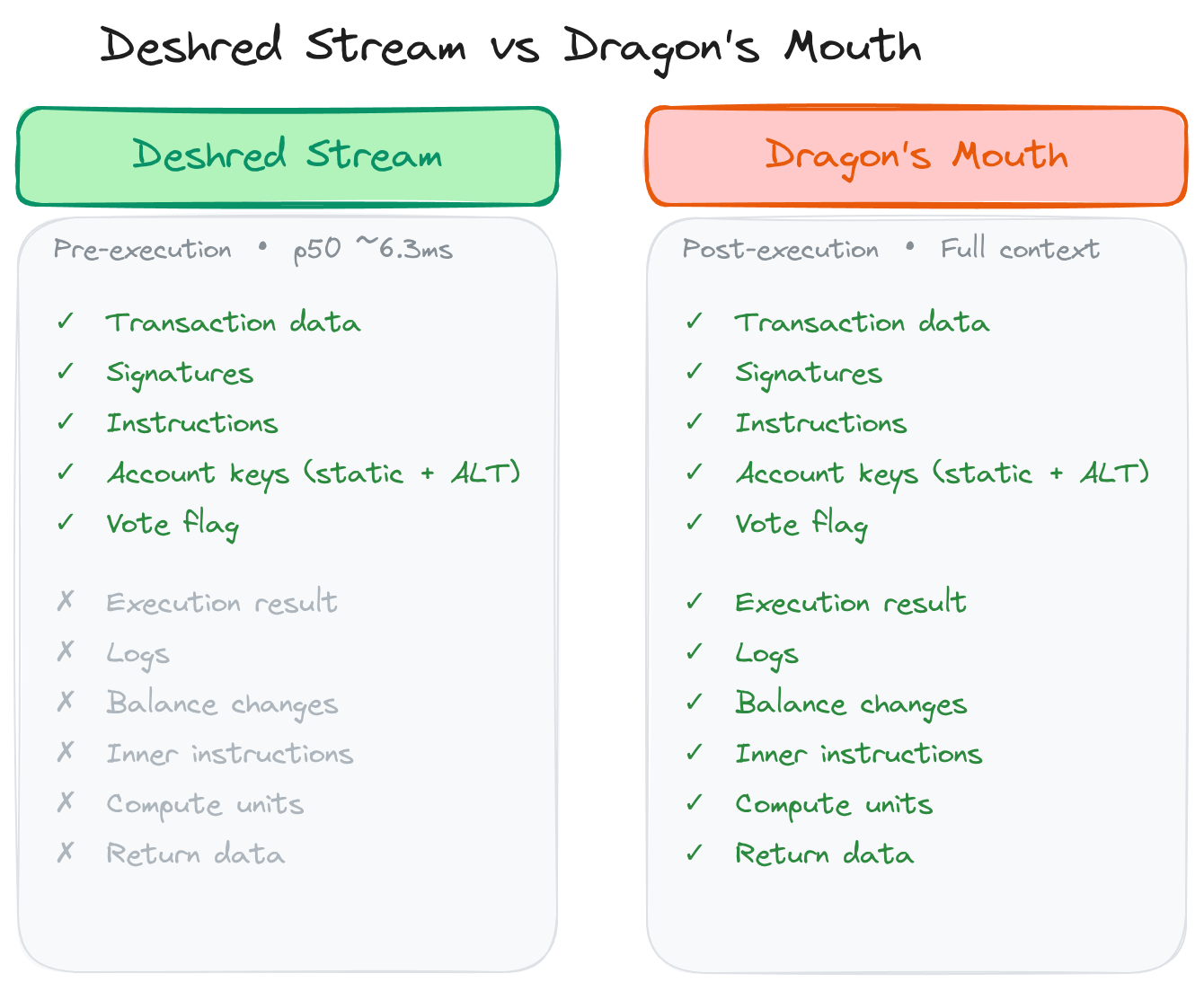 Intercepting the pipeline that early does, however, come at a cost: some information simply isn't available yet. Here's how it stacks up against Triton's Yellowstone gRPC, the ecosystem's go-to streaming standard, on both features and datapoints.