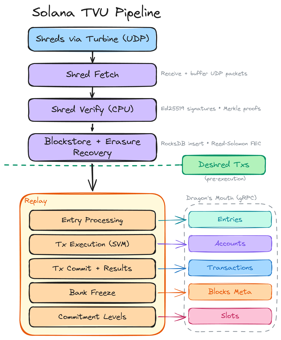 Deshred streams address this by intercepting the pipeline immediately after shred arrival and entry reconstruction, at the CompletedDataSets (Blockstore) stage, bypassing the Replay stage entirely and streaming decoded transactions directly to your backend over gRPC.