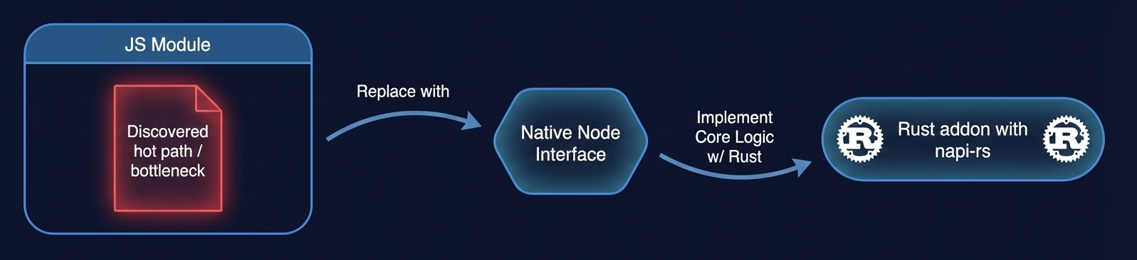 The core of NaaE is to deliberately optimise hot paths with Rust via napi-rs, while maintaining greater ecosystem compatibility in JS by utilising native interfaces as wrappers.
