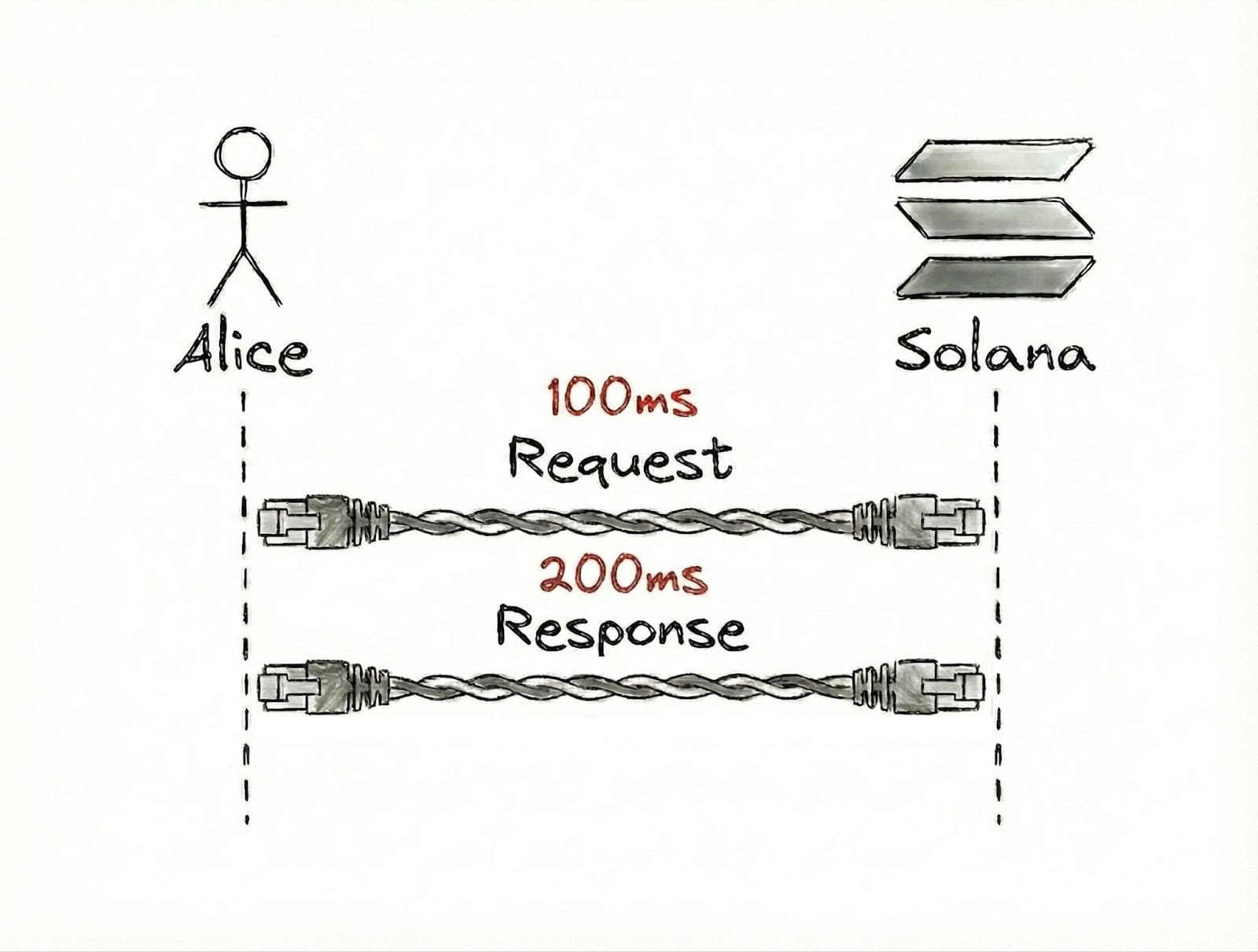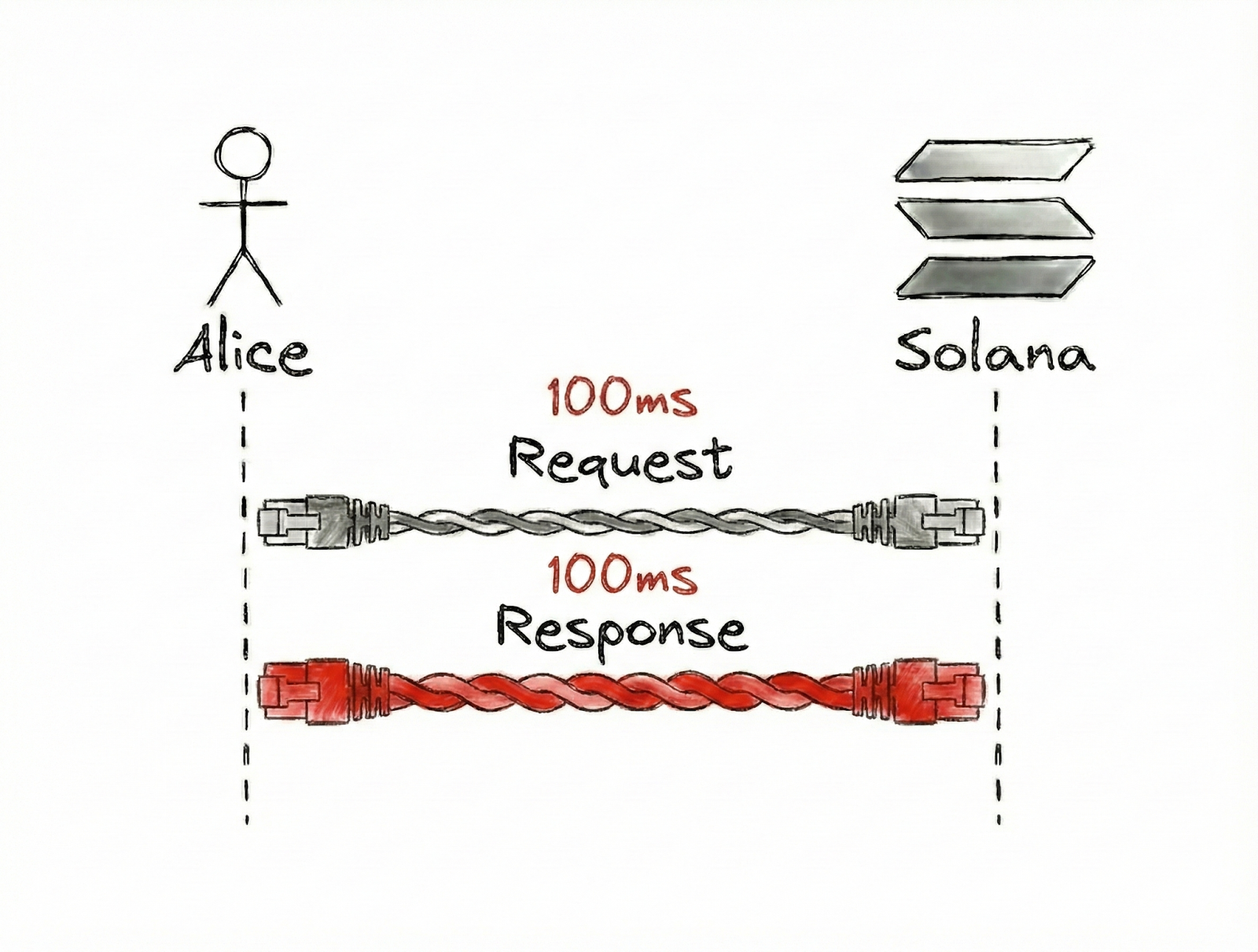 The amount of wire Alice’s and Solana’s data must travel is astronomical (literally), therefore, introducing unavoidable physical latency into their communication. This highlights another layer that, from Alice’s point of view, affects the cumulative latency.