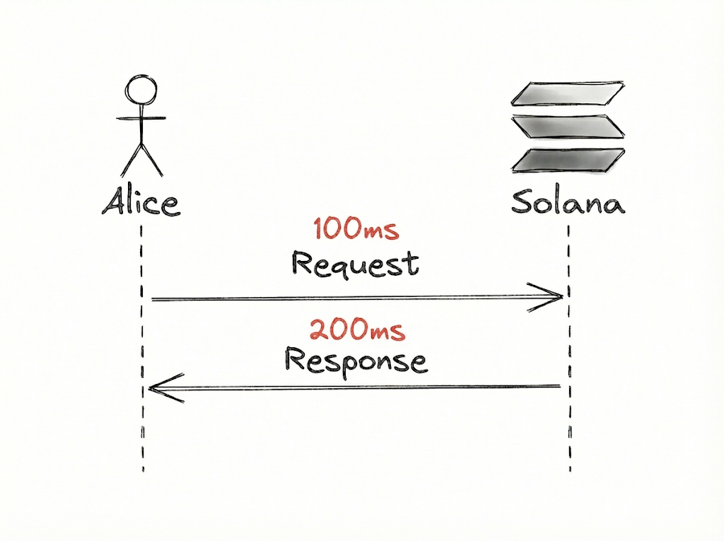 If it takes 100ms for Alice’s request to be sent and 200ms for it to be received, then Alice’s perceived latency is cumulatively 300ms.