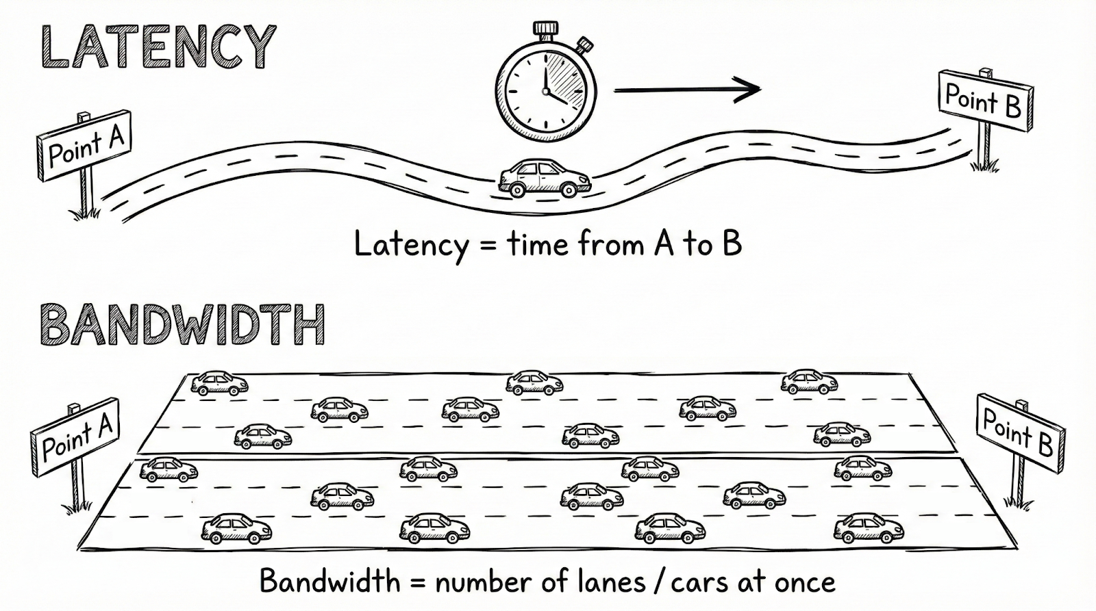 The most common analogy is traffic on a road. Latency is the time it takes for a single car to travel from Point A to Point B. Bandwidth is the number of lanes, which limits how many cars can travel simultaneously.