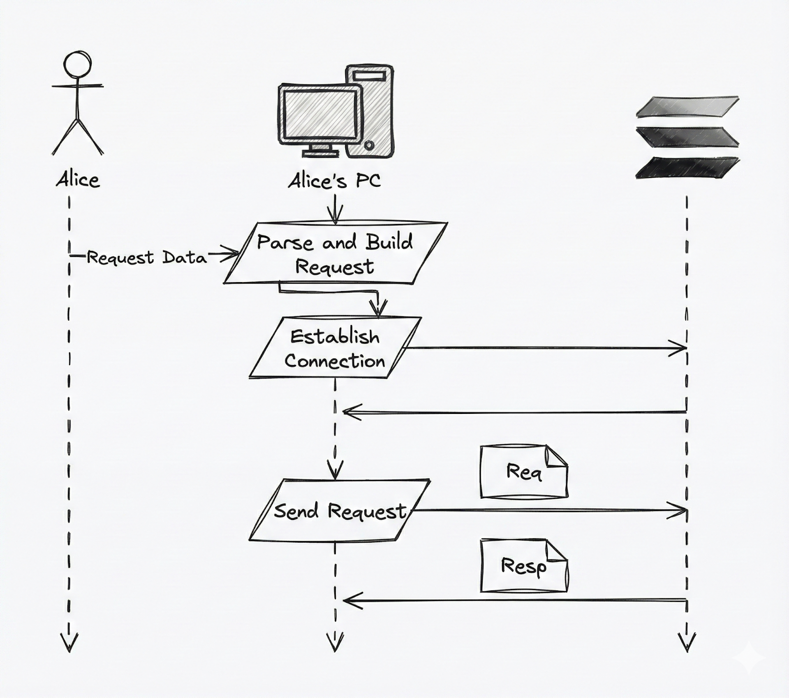 However, for simplicity, we will use the analogy below to represent the lifetime of Alice’s request, and we’ll modify and expand this analogy as we go along.