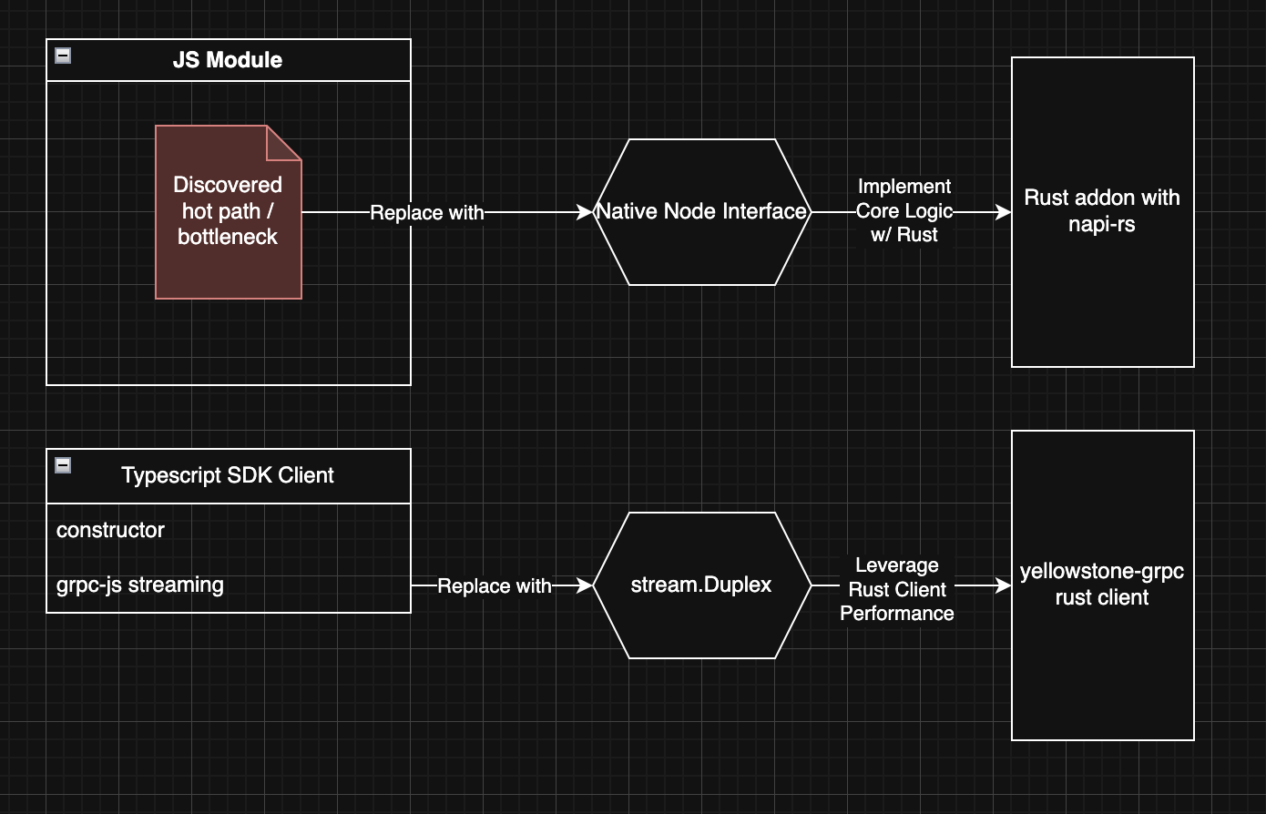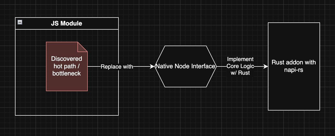 After exploring different methods of interaction across Node and Rust, we have arrived at an optimal interaction between the two ecosystems that enables the following:
